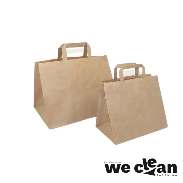 Shopper asporto fondo largo in carta avana. Shopper resistenti in carta kraft. La shopper ha la grande particolarità di avere il fondo largo progettato per il trasporto di vassoi in cartone per pasticceria, caffè d’asporto, gastronomia. Sono disponibili due formati utili a contenere due misure di vassoi in cartone standard. Le misure indicano in ordine: base, soffietto e altezza della shopper.