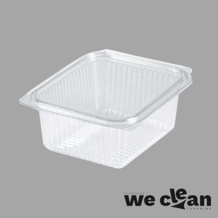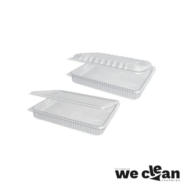 Caratteristiche : Vaschette trasparenti di forma rettangolare, con coperchio integrato e incernierato su un lato del contenitore. Queste vaschette sono quindi comodamente richiudibili piu volte. La forma delle vaschette con coperchio è particolarmente indicata per il servizio a banco nelle gastronomie e nei supermercati, oltre che per l’esposizione nel banco take away.