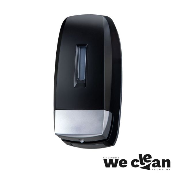 Caratteristiche : Distributore di sapone murale. Cover in ABS nero. Base in ABS argento. Per tutti i tipi di sapone salvo a microgranuli. Sistema push anti-goccia. Tanica in plastica a riempimento 0,5 lt. dim. 101x93x209h mm