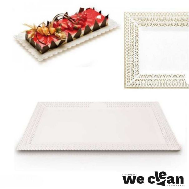 Caratteristiche : VASSOIO TRINATO RETTANGOLARE CM 26X45 IN PLASTICA BIANCO PASTICCERIA PORTATORTA